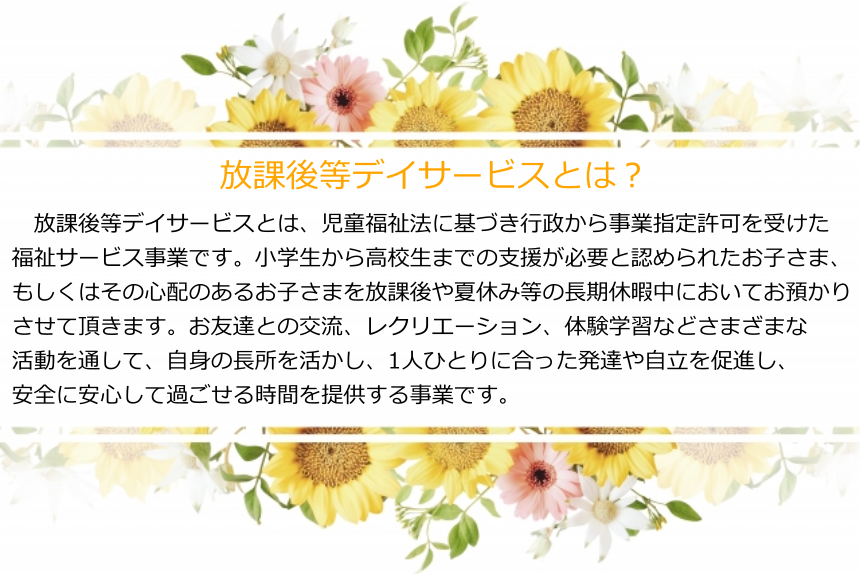 | 子どもの個性を尊重し1人ひとりのいいところ、できることに目を向け、できたことを共に喜ぶ。 目の前にある小さな自立を積み重ね、見守り、その子に合った自立へと繋がるようお手伝いします。 あきらめない姿勢で子どもたちと笑顔と達成感を分かち合える事業所を目指します。 |